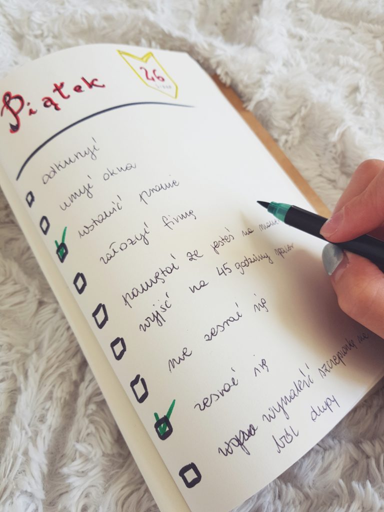 Odetchnij, kurde. Obetnij swój plan dnia o połowę i ciesz się z tego, co Ci się udało. Zyskałaś trochę czasu? Zajebiście, wtedy dopisz coś do listy.