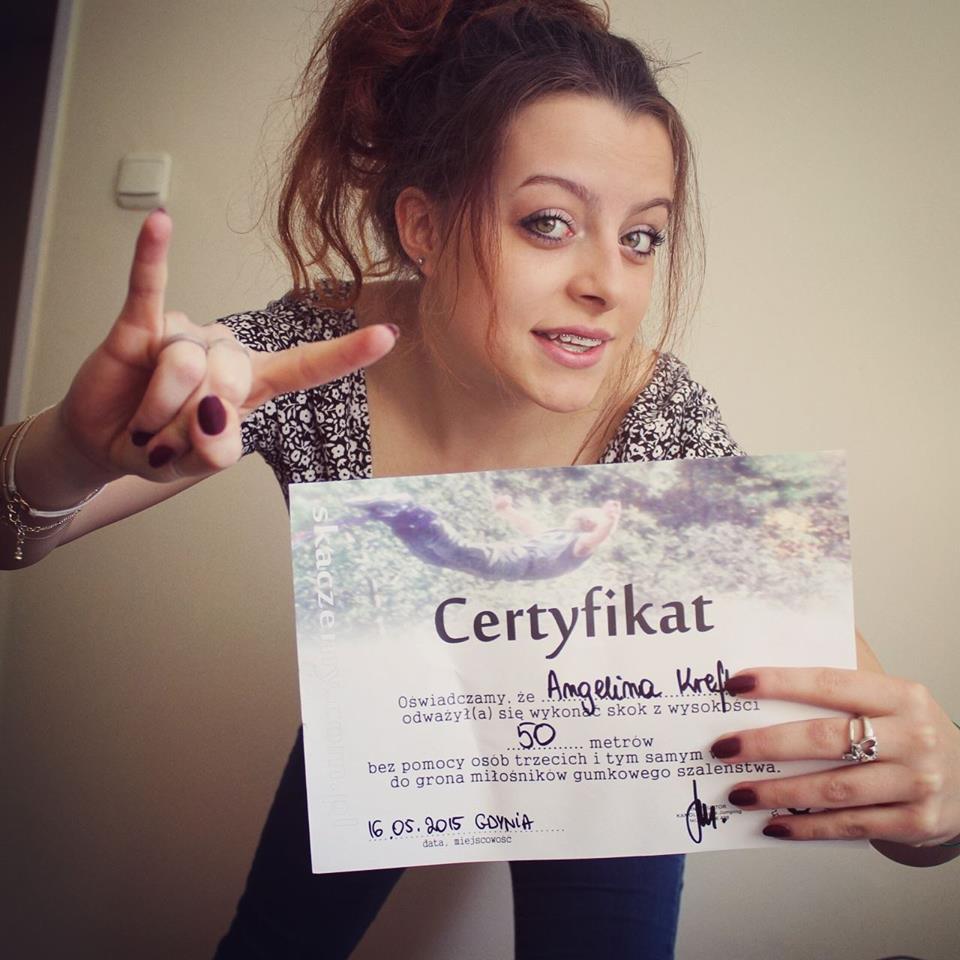 Zaczęły się namowy i tak stałam w kolejce mówiąc, że no nie skocze. Patrzyłam z jakiej wysokości fruną ludzie w dół i robiłam w portki. „Angelina, Ty ponoć skaczesz, zajebiście” „yyy yy ale ja nie skacze ja…” ja po prostu dalej stałam w tej kolejce i przeżywałam wszystkie emocje. Serio: niedowierzanie, nerwy, radość. A potem Cię ważą, składasz podpis, przypinają Cię za nogi i jedziesz windą do nieba. Gdy już jechałam do góry przyznam, że byłam najspokojniejszym człowiekiem w całej swojej karierze. Na dole miałam wsparcie znajomych, którzy mi dopingowali a u góry coraz piękniejszy widok. (Albo organizm po ostatniej godzinie jazdy nie był w stanie wykrzepać już żadnych emocji)